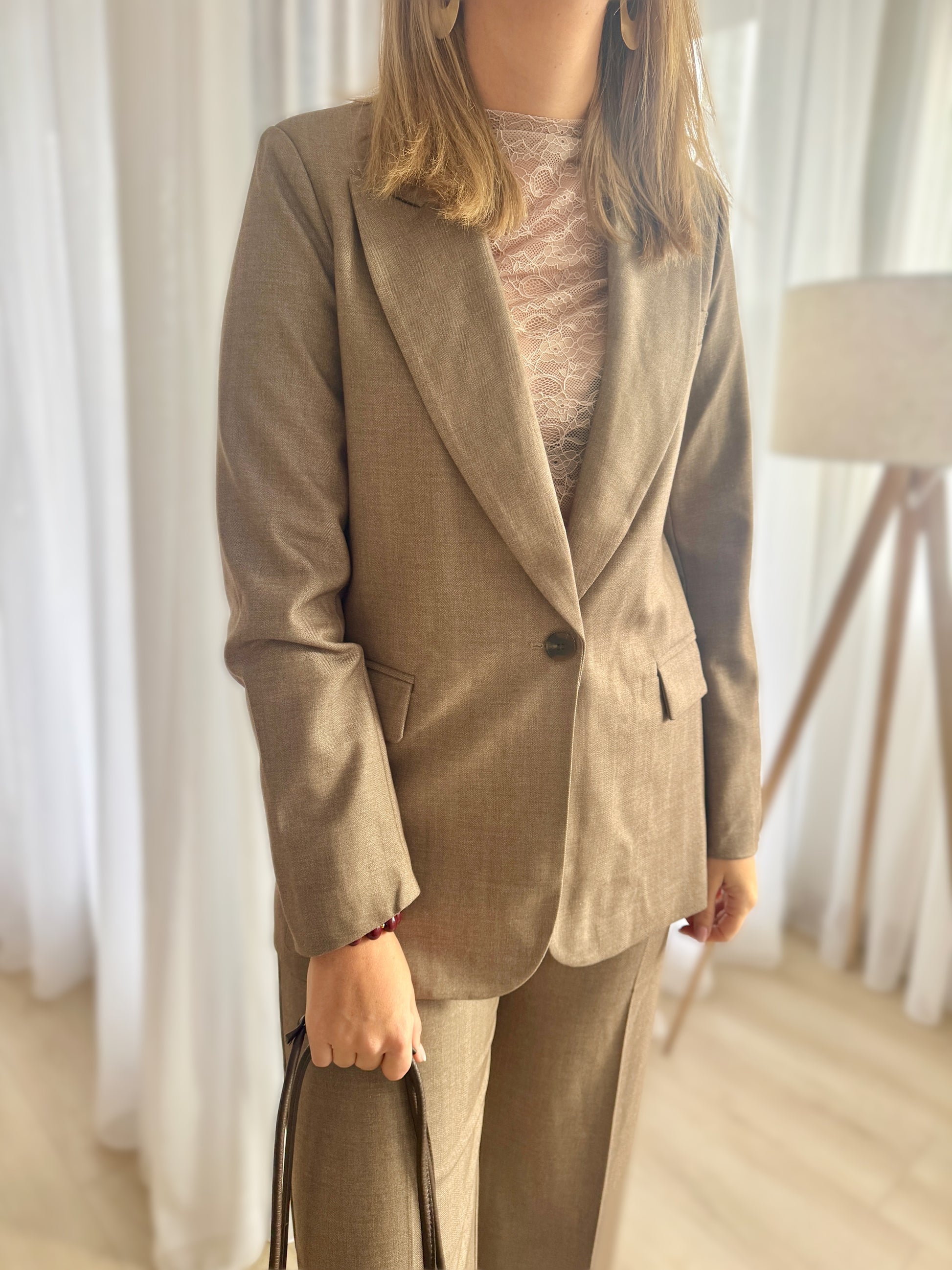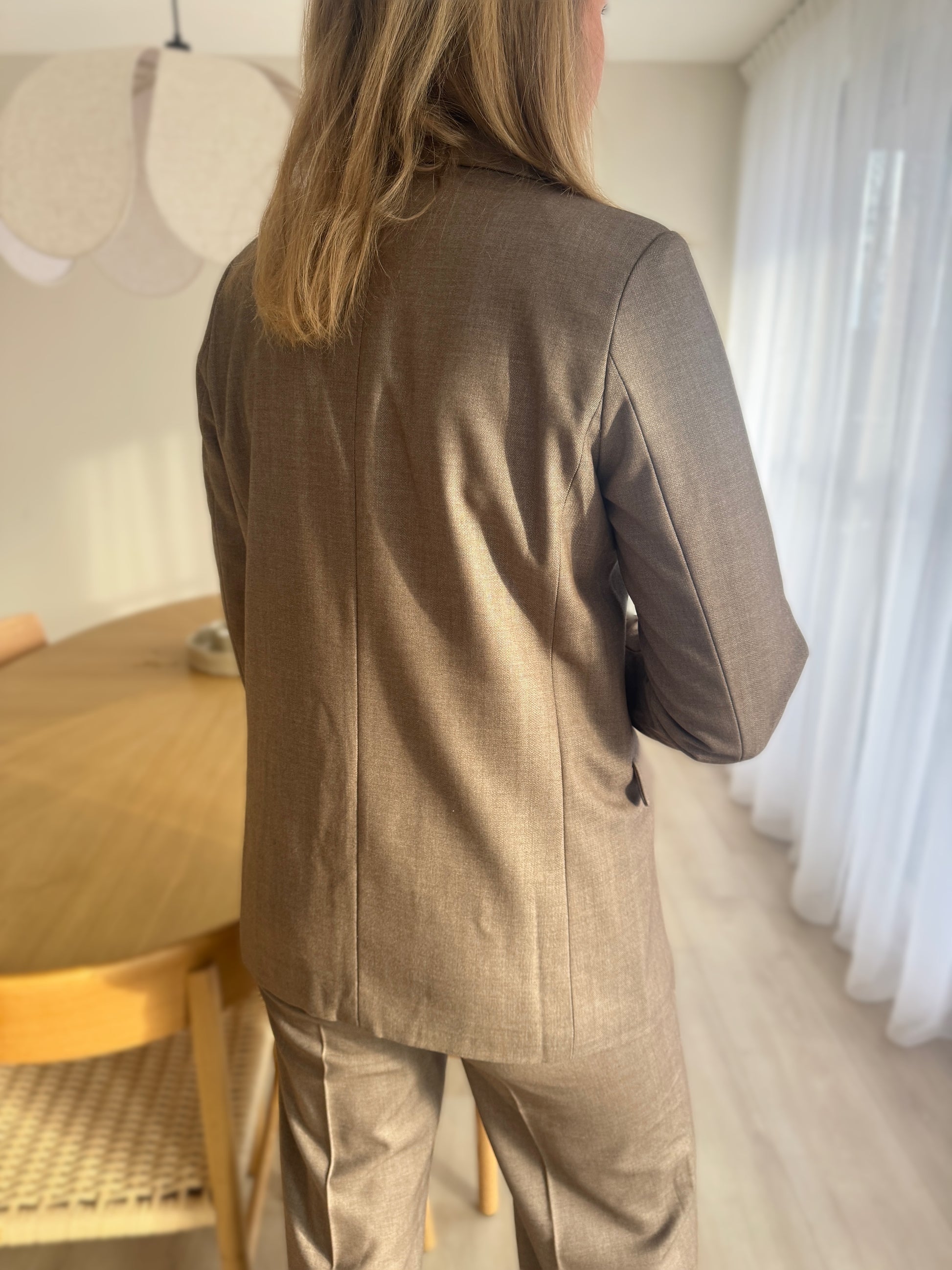 Deze blazer heeft een losse, langere pasvorm voor een elegante en moderne look. Perfect te combineren met een skort of de bijpassende broek voor een chic kostuum. Draag hem casual op een jeans voor een moeiteloos stijlvolle outfit. De taupe kleur maakt hem makkelijk te combineren – een echte must-have voor elke garderobe!