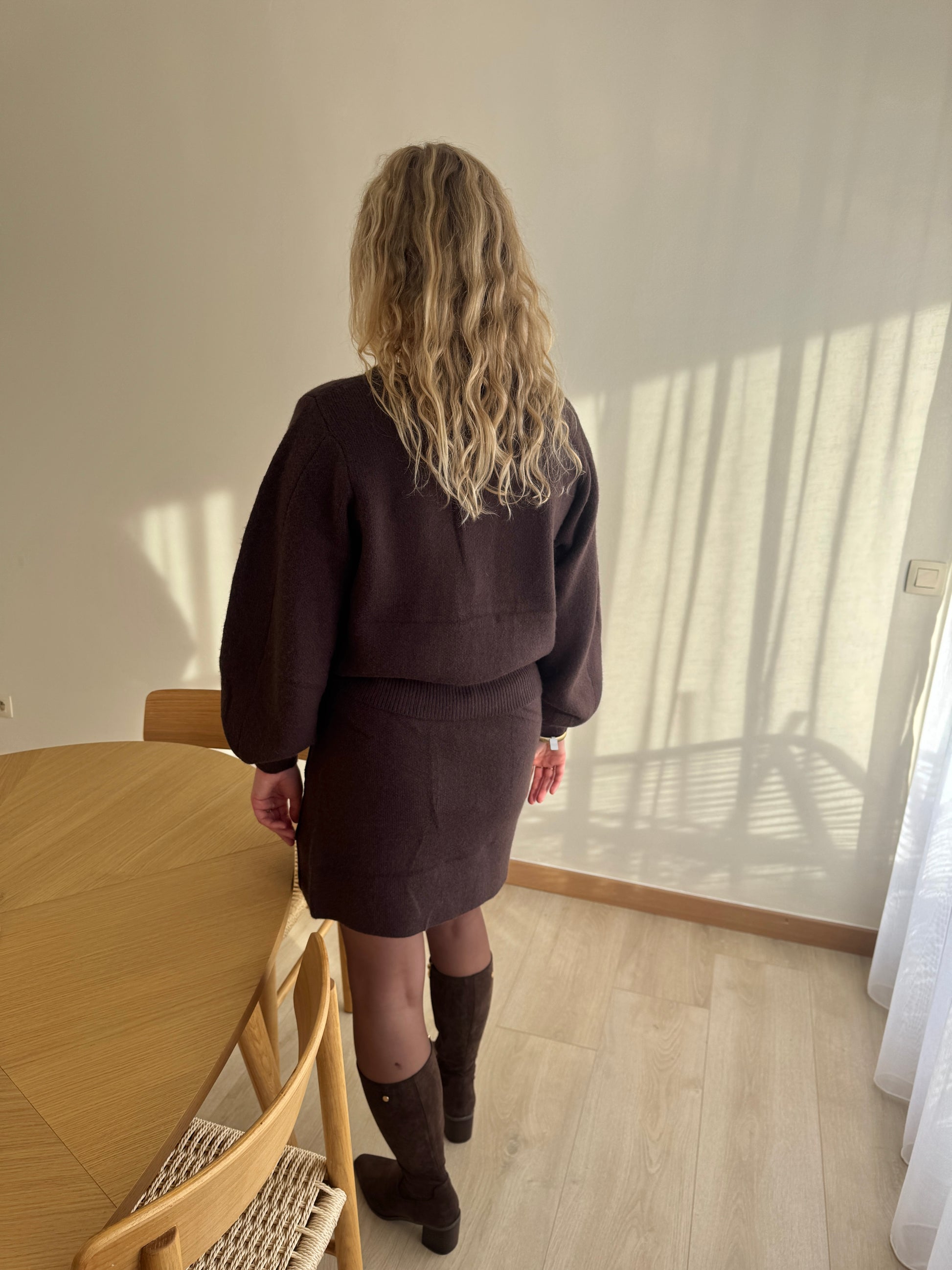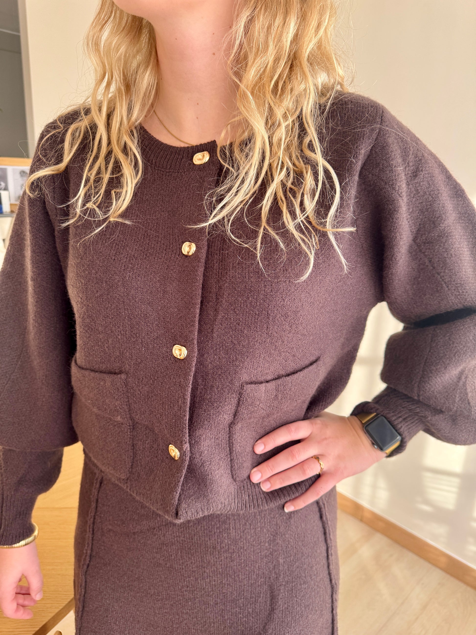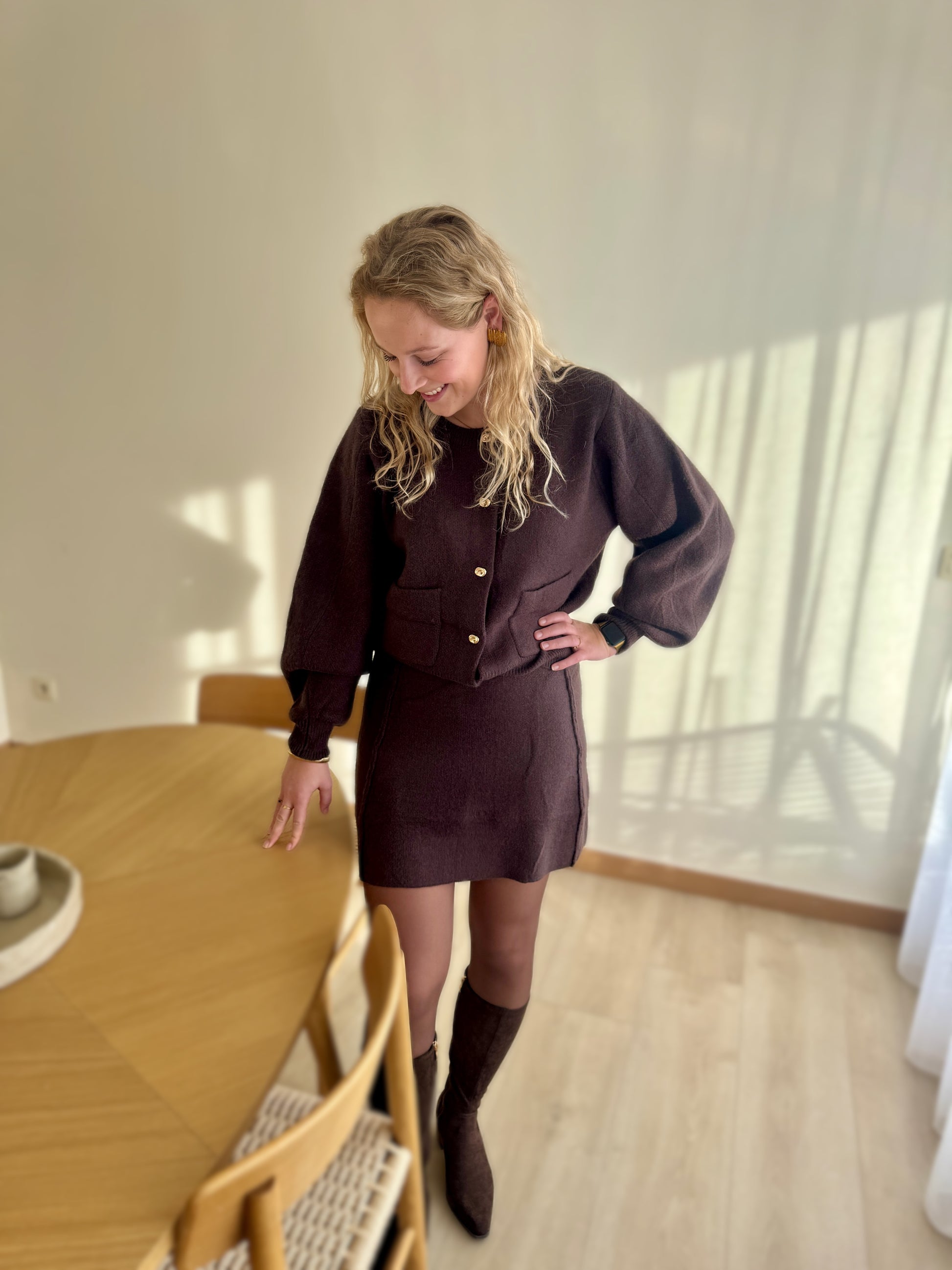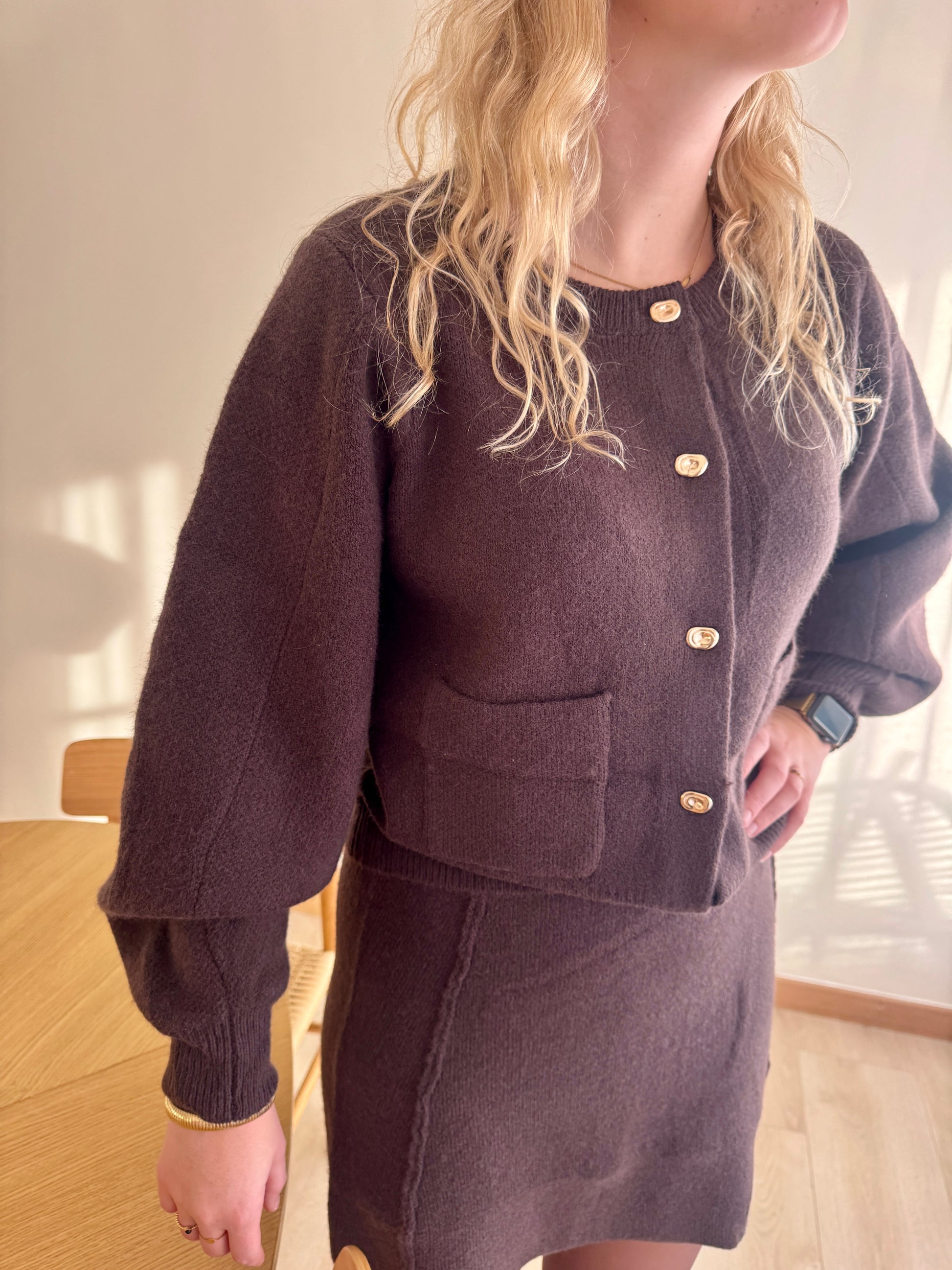 Dit prachtige setje bestaat uit een rokje en een bijpassende cardigan met elegante goudkleurige knoopjes.